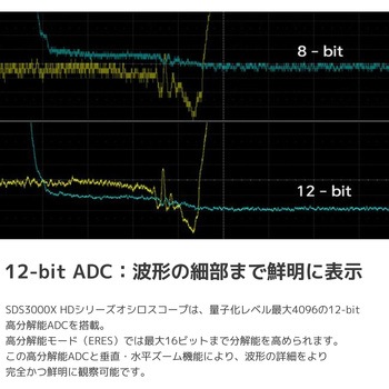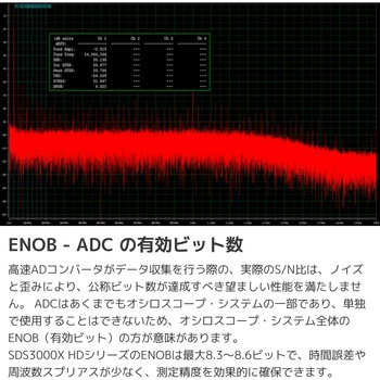 【低ノイズ設計】 1GHz帯域でも125µVrmsの低ノイズフロアを実現。ENOB最大8.5ビットにより、時間誤差やスプリアスを抑制し、精度の高い信号観測が可能。