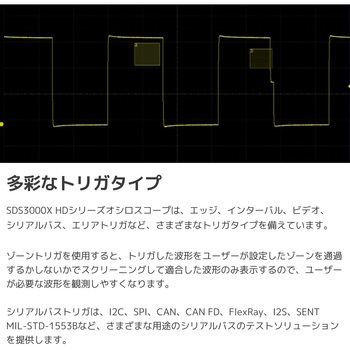 【多彩なトリガ&解析機能】 エッジやインターバル、エリアトリガに加え、I2C、SPI、CAN、LIN、FlexRayなどシリアルバス解析を標準搭載。組込み開発から車載評価まで幅広く対応。