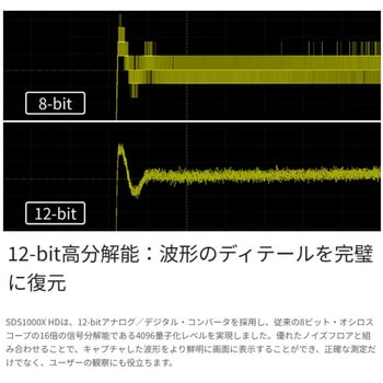 【高精度12-bit分解能で正確な波形解析】 従来の8ビット機の16倍となる4096段階の分解能を実現。ノイズフロア70μVrmsと低く、電源リップルや微小信号の解析に最適。正確な測定と鮮明な表示で研究開発や教育現場でも安心して使用できます。