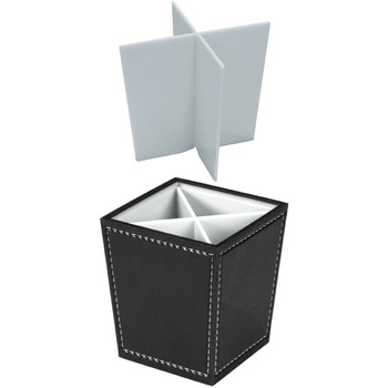 サイズは8.8cm角で高さ10cmのツールスタンドです。中の仕切り板が2枚あり、組み合わせて入れると4分割に仕切れます。1枚だけを対角線に入れると2分割に仕切れます。仕切りなしでも使えます。用途に合わせて仕切りを使いやすく変えられます。ペンなどの文具や、キッチン、洗面所、化粧小物などの整理に便利です。外側の素材は弾性のあるエラストマーで、ソフトな手触り。皮革にステッチが入っているような高級感のあるデザインをプラスチックで実現しました。水濡れにも強く、置き場所を選びません。シンプルで汎用性のある小物立てです。