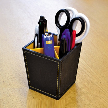 サイズは8.8cm角で高さ10cmのツールスタンドです。中の仕切り板が2枚あり、組み合わせて入れると4分割に仕切れます。1枚だけを対角線に入れると2分割に仕切れます。仕切りなしでも使えます。用途に合わせて仕切りを使いやすく変えられます。ペンなどの文具や、キッチン、洗面所、化粧小物などの整理に便利です。外側の素材は弾性のあるエラストマーで、ソフトな手触り。皮革にステッチが入っているような高級感のあるデザインをプラスチックで実現しました。水濡れにも強く、置き場所を選びません。シンプルで汎用性のある小物立てです。
