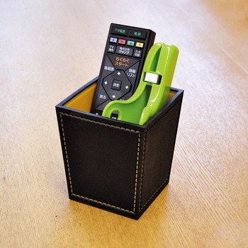サイズは8.8cm角で高さ10cmのツールスタンドです。中の仕切り板が2枚あり、組み合わせて入れると4分割に仕切れます。1枚だけを対角線に入れると2分割に仕切れます。仕切りなしでも使えます。用途に合わせて仕切りを使いやすく変えられます。ペンなどの文具や、キッチン、洗面所、化粧小物などの整理に便利です。外側の素材は弾性のあるエラストマーで、ソフトな手触り。皮革にステッチが入っているような高級感のあるデザインをプラスチックで実現しました。水濡れにも強く、置き場所を選びません。シンプルで汎用性のある小物立てです。