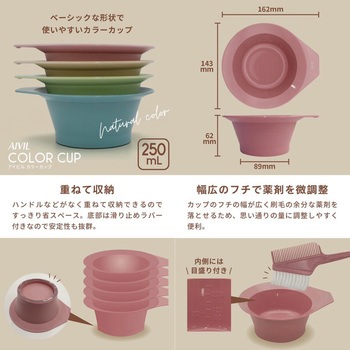 底部滑り止めラバー付きヘアカラー用カップ。目盛りが付いていますので容量がひと目でわかります。安定性があり大量の薬剤を入れることができます。