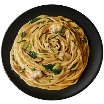 超もち生パスタのこだわり!それぞれのソースに相性ピッタリのこだわり麺を合わせております。麺とソースが絡む一体感を最後の一口までお楽しみください。芳醇バター醤油風味は香ばしい醤油とバターの風味がクセになる味わいで、もちもち食感スパゲティを使用。野沢菜を使用し、あさり、のり、乾燥ねぎをトッピングしています。