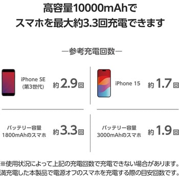 本製品(バッテリー容量10000mAh)で、1800mAhのスマートフォンを約3.3回、3000mAhのスマートフォンを約1.9回充電可能です。