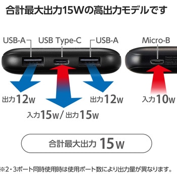 USB-Aポート×2、USB Type-C(TM)ポート×1の3ポートから出力可能。USB-Aポートからは最大12W、USB Type-Cポートからは最大15Wで充電できます。