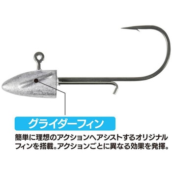 用途ヘッドは「ただ巻き時」に安定した水平姿勢を生み、「ダートアクション」にも対応する砲弾型と矢尻型のハイブリッド形状。ヘッド側部に設けたグライダーフィンはレンジキープ性を高め、ダート時には滑空するように距離の長いダート幅に貢献する。刺さりが良く靭性が高いフックを採用し、大型シーバスとのファイトにも粘り強く対応。ワイヤーキーパーにより高いホールド性を維持しながら、奇麗なワームセッティングが可能となっている。 *グラインダーフィン:簡単に理想のアクションへアシストするオリジナルフィンを搭載。アクションごとに異なる効果を発揮。