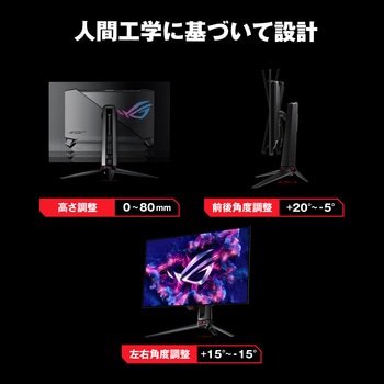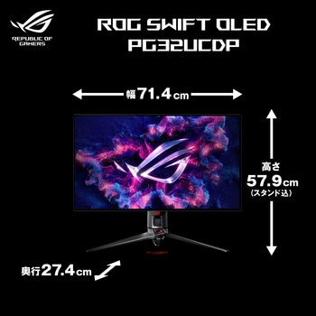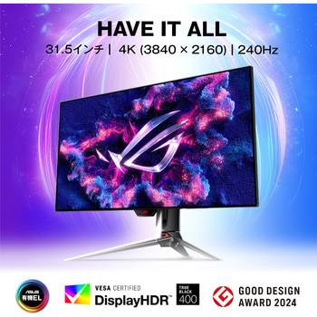 その他コンプライアンスと基準:TUV Flicker-free、TUV Low Blue Light (Hardware Solution)、VESA DisplayHDR 400 True Black、AMD FreeSync Premium Pro、FSC MIX付属品キャリブレーションレポート、DisplayPortケーブル、Ultra High Speed HDMIケーブル、Microfiber cloth、電源アダプター、電源コード、クイックスタートガイド、ROGポーチ、USB 3.2ケーブル、USB-Cケーブル、VESAマウントキット、保証書質量(kg)スタンド付き:、7.3(16.09 lbs)、スタンドなし:、4.5(9.92 lbs)、総質量:、13.5 (29.76 lbs)電源(V)100~240表面処理ノングレア範囲本体調節:上下角度調節 (チルト) 上20°~下5°、左右角度調節(スウィーベル) 左右15°、高さ調節 0~80mm、縦回転(ピボット) なし対応ケンジントンセキュリティースロット:搭載機能ビデオ:ROG A.I. Assistant Technology :搭載、色精度 :△E≦ 2、GamePlus機能 :搭載、ブルーライト軽減機能 :搭載、HDCP :対応(2.2)、Game Visual機能 :搭載、VRR テクノロジー :搭載 (Adaptive-Sync)、Extreme Low Motion Blur:搭載、HDR モード :搭載、Shadow Boost :搭載、ディスプレイ ウィジェット :搭載、DisplayWidget Center、PIP(PBP)テクノロジー :搭載(60Hz)、Aspect Control :搭載、KVMスイッチ :搭載、搭載技術:ROG A.I.アシスタントテクノロジー、GamePlus機能 、ブルーライト軽減機能 、HDCP Support : 2.2、Extreme Low Motion Blur 、HDR モード 、Shadow Boost 、PIP (PBP) テクノロジーコントラスト比1500000:1(標準)液晶パネルパネルサイズ(インチ) :31.5、表示領域 (H x V) :696.6×391.8 mm、表面仕様 :Anti-Glare、画素ピッチ :0.182mm、輝度 (最大) :450cd/m、輝度 (HDR/ピーク) :1/300 cd/m、輝度 (100% APL) :250cd/m、視野角 (CR≧10/H / V) :178°/ 178°、応答速度:0.03ms(GTG)、表示色:1073.7M (10 bit)、フリッカーフリー技術 :搭載、HDR (ハイダイナミックレンジ) サポート :HDR10、リフレッシュレート(最大) :240Hz、Dual Mode :搭載/ Frame Rate Boost、ASUS OLED Care :搭載最大解像度3840×2160保証期間3年(パネルの焼き付き含む)色(本体)ブラックRoHS指令(10物質対応)対応アスペクト比16:9(99%)走査周波数デジタル :、4K mode:、HDMI: 30~585khz(H) /24~240Hz (V)、DP/Type-C: 510~510kHz (H) /48~240Hz (V)、FHD mode:、HDMI: 30~640kHz (H) / 50~480Hz (V)、DP/Type-C: 510~510kHz (H) / 48~480Hz (V)入出力端子デジタル入力:DisplayPort 1.4 DSC×1、HDMI(v2.1)×2、USB-C×1(DP Alt Mode)、USB-C Power Delivery:90W/USB HUB:USB 3.2 Gen 1 Type-A×3/オーディオ出力:3.5mmステレオミニジャック、SPDIF out(Optical Digital Audio Out)I/OポートDisplayPort 1.4 DSC ×1、HDMI (v2.1) x 2、USB-C x 1 (DP Alt Mode)、イヤホンジャック :あり、USB Hub :3x USB 3.2 Gen 1 Type-A、USB-C 電力供給 :90W、SPDIF out (Optical Digital Audio Out):あり本体寸法(cm)(幅×高さ×奥行き):71.4×43.0×7.1(28.11×16.93×2.80)、スタンド付き(幅×高さ×奥行き):71.4×57.9×27.4(28.11×22.80×10.79)パネル駆動方式WOLED対応VESA規格100×100mm内容量1台