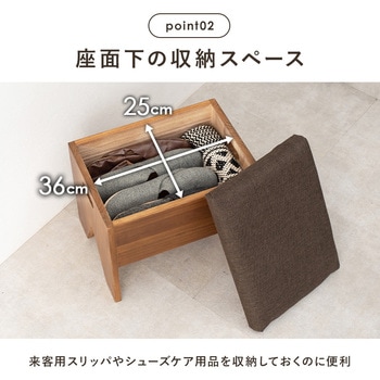 収納もできる便利な玄関ベンチ。座面高さが37cmなので玄関に置くと、ちょっとした腰かけに使えて便利です。座面下の収納スペースには、来客用スリッパやケア用品が収納できます。さらに、ベンチ下の幅が36cmあるので、ここにも約2足収納することができます。また、シンプルなデザインなので、リビングや廊下でもお使いいただけます。