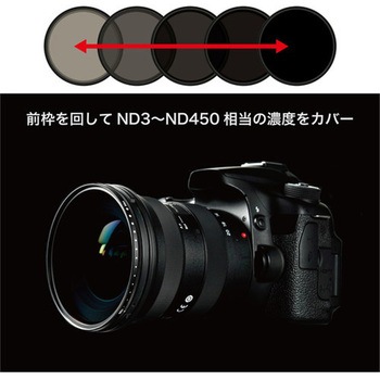 バリアブルND Initialは、前枠を回転することで減光量を調整できる可変NDフィルターです。ND3~ND450相当*の濃度を1枚でカバーします。一眼動画撮影で露出オーバーを防ぐのに欠かせないフィルターで、静止画でのスローシャッター撮影にもお使いいただけます。*焦点距離70mm以上で使用の場合にND450相当までお使いいただけます。濃度をMaxに近づけた時に映像にX状のムラを生じることがあります。使用するレンズの焦点距離が短いほどこの現象は起こりやすくなります。