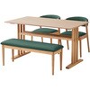 ダイニングテーブル1台とチェア2脚、ベンチ1脚の4点セットです。テーブルは天板にはオークの突板を使用しているので、天然素材のぬくもりと高級感を感じられます。天板表面にウレタン塗装をしているので、傷がつきにくく長くきれいにお使いいただけます。脚がT字になっているので立ち座りも楽に行えます。チェアは座面と背もたれはファブリックで暖みがあります。背もたれは背中を包み込むようなカーブを描いているのが特徴です。3色からお選びいただけます。