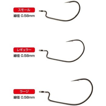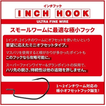 1~2インチワーム対応の極小オフセットフック誕生! 1インチ、2インチのワームにオフセットフックを使いたいという要望に応えたミニオフセットタイプ。マスバリを使用すると根がかりが多かったポイントもこのフックなら攻略可能に。スーパーファインワイヤー&グランポイントの採用で、ハリ先の鋭さ、持続性は他の追随を許しません。