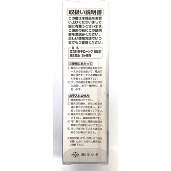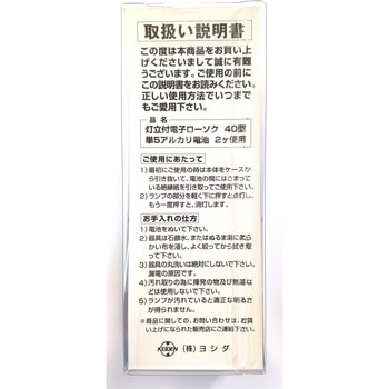 <お手入れの仕方> 1)電池をぬいて下さい。 2)器具は石鹸水、またはぬるま湯に柔らかい布を浸し、よく絞ってから拭き取って下さい。 3)器具の丸洗いは絶対にしないで下さい。漏電の原因です。 4)汚れ取りの為に揮発の物及び熱湯などは使用しないで下さい。 5)ランプは汚れていると適正な明るさが得られません。 *商品に関してのお問い合わせは、お買い上げになられた販売店にご連絡下さい。