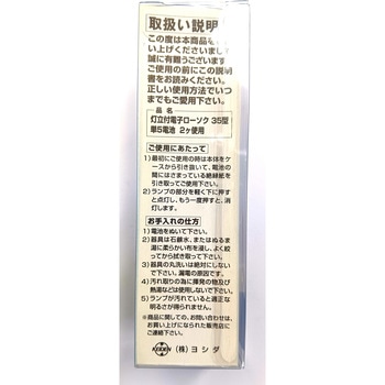 用途<ご使用にあたって> 1)最初にご使用の時は本体をケースから引き抜いて、電池の間にはさまっている絶縁紙を引き取ってご使用下さい。 2)ランプの部分を軽く下に押すと点灯し、もう一度押すと、消灯します。電池(付属)アルカリ単5電池2個内容量1個