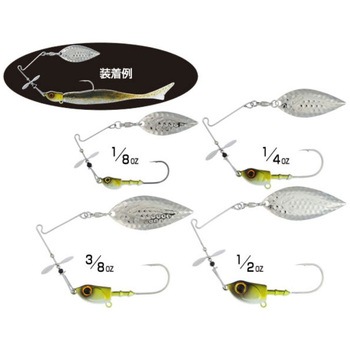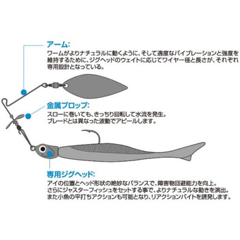 ジグスピナーの特徴となるヘッド部分の可動を最大限に生かす、専用ジグヘッドの装着により、ワームの動きがよりナチュラルに、時にイレギュラーとなる平打ちアクションを実現。さらに金属ブレード&プロップから繰り出される波動が組み合わさり、まさにスピナーベイトとスイミングワームとの融合。高次元なサーチベイトとして、あらゆる角度からアピールする事ができます。