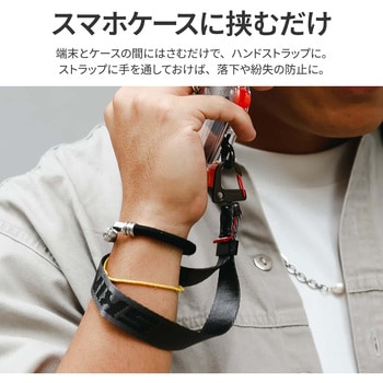 ロゴがエンボス加工されたファブリック素材のハンドストラップ/金属製のカラビナフック付き/お好みの長さに調節可能/端末のケースに取り付け可能な挟み込みシート付属