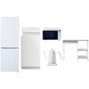 用途寮や事務所、休憩室などに。会社 オフィス 事務室 休憩室 仮眠室 ラウンジ 給湯室 寮 合宿 施設 宿泊 民泊 ホテル 旅館 宿舎 新生活 引越し 単身赴任 大学入学 スターターセット 家電セット 冷蔵庫 洗濯機 オーブンレンジ 温調ケトル レンジラック仕様【オーブンレンジ】幅48.5×奥行37.6×高さ30.2cm●容量18L、フラットテーブル●高周波出力:650W(60Hzのみ)/500W/200W相当【ラック】幅102.5×奥行46.5×高さ85.5cm●棚やコンセントの高さを、モノに合わせて変更可能●2口コンセント付き(計1500Wまで)でよく使う家電や雑貨をすっきりひとまとめ【冷蔵庫】幅47.4×奥行50.6×高さ144cm●容量:157L(冷蔵109L/冷凍48L)●年間消費電力量:268kWh/年(50Hz/60Hz)【洗濯機】幅56×奥行54.5×高さ98cm●容量:6.0kg(洗濯時)、1.5kg(風乾燥時)●8つのコース搭載(標準・毛布・おいそぎ・ドライ・ソフト・つけおき・部屋干し・槽洗浄)【電気ケトル】幅28.5×奥行18×高さ22.5cm●容量:800ml●温度設定範囲:60-100度の間で1度単位で温度調整可能セット内容洗濯機、冷蔵庫、オーブンレンジ、温調ケトル、レンジラック保証期間1年(ラック以外)内容量1セット