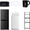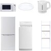 用途寮や事務所、休憩室などに。会社 オフィス 事務室 休憩室 仮眠室 ラウンジ 給湯室 寮 合宿 施設 宿泊 民泊 ホテル 旅館 宿舎 新生活 引越し 単身赴任 大学入学 スターターセット 家電セット 冷蔵庫 洗濯機 電子レンジ シーリングライト 電気ケトル 家電収納ラックその他シーリング仕様:幅50×奥行50×高さ9.5cm、全光束:3500lm、30分、60分OFFタイマー付き適合冷蔵庫仕様:幅47.4×奥行49.5×高さ113cm、容量:106L(冷蔵室73L/冷凍室33L)、年間消費電力量:268kWh/年(50Hz/60Hz)セット内容洗濯機、冷蔵庫、電子レンジ、シーリングライト、電気ケトル、家電収納ラック対応洗濯機仕様:幅56×奥行54.5×高さ98cm、容量:6.0kg(洗濯時)、1.5kg(風乾燥時)、8つのコース搭載(標準・毛布・おいそぎ・ドライ・ソフト・つけおき・部屋干し・槽洗浄)レンジ電子レンジ仕様:幅44×奥行32.5×高さ25.5cm、容量17L、ターンテーブル、高周波出力:50Hz(500W、200W相当)、60Hz(650W、500W、200W相当)保証期間1年(ラック以外)適合ラック●幅59×奥行40×高さ192.5cm●棚やコンセントの高さを、モノに合わせて変更可能●2口コンセント付き(計1500Wまで)でよく使う家電や雑貨をすっきりひとまとめ電気仕様ケトル:幅21.5×奥行15×高さ18.5cm、容量:1.0L、空焚き防止機能搭載内容量1セット