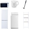 用途寮や事務所、休憩室などに。会社 オフィス 事務室 休憩室 仮眠室 ラウンジ 給湯室 寮 合宿 施設 宿泊 民泊 ホテル 旅館 宿舎 新生活 引越し 単身赴任 大学入学 スターターセット 家電セット 冷蔵庫 洗濯機 オーブンレンジ 電気ケトル 軽量クリーナー 家電収納ラック仕様【洗濯機】幅56×奥行54.5×高さ98cm●容量:6.0kg(洗濯時)、1.5kg(風乾燥時)●8つのコース搭載(標準・毛布・おいそぎ・ドライ・ソフト・つけおき・部屋干し・槽洗浄)【オーブンレンジ】幅48.5×奥行37.6×高さ30.2cm●容量18L、フラットテーブル●高周波出力:650W(60Hzのみ)/500W/200W相当【ラック】幅59×奥行40×高さ192.5cm●棚やコンセントの高さを、モノに合わせて変更可能●2口コンセント付き(計1500Wまで)でよく使う家電や雑貨をすっきりひとまとめ【冷蔵庫】幅47.4×奥行50.6×高さ144cm●容量:157L(冷蔵109L/冷凍48L)●年間消費電力量:268kWh/年(50Hz/60Hz)【掃除機】スティック時サイズ:幅22.6×奥行10.3×高さ100cm●ハンディ時サイズ:幅7.5×奥行7.5×高さ46cm●わずか870gの軽量クリーナー●吸込仕事率:(パワフル)46W、(標準)23W、(弱)15W【電気ケトル】幅21.5×奥行15×高さ18.5cm●容量:1.0L●空焚き防止機能搭載セット内容洗濯機、冷蔵庫、オーブンレンジ、電気ケトル、軽量クリーナー、家電収納ラック保証期間1年(ラック以外)内容量1セット