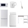 用途寮や事務所、休憩室などに。会社 オフィス 事務室 休憩室 仮眠室 ラウンジ 給湯室 寮 合宿 施設 宿泊 民泊 ホテル 旅館 宿舎 新生活 引越し 単身赴任 大学入学 スターターセット 家電セット 冷蔵庫 洗濯機 電子レンジ 電気ケトル スティッククリーナー レンジラック適合冷蔵庫仕様:幅47.4×奥行49.5×高さ113cm、容量:106L(冷蔵室73L/冷凍室33L)、年間消費電力量:268kWh/年(50Hz/60Hz)セット内容洗濯機、冷蔵庫、電子レンジ、電気ケトル、スティッククリーナー、レンジラックサイズ(cm)(掃除機仕様)スティック時:幅24×奥行13×高さ111cm、ハンディ時:幅10×奥行10.5×高さ48cm、スティック&ハンディの2WAY、吸込仕事率:40W対応洗濯機仕様:幅56×奥行54.5×高さ98cm、容量:6.0kg(洗濯時)、1.5kg(風乾燥時)、8つのコース搭載(標準・毛布・おいそぎ・ドライ・ソフト・つけおき・部屋干し・槽洗浄)レンジ電子レンジ仕様:幅44×奥行32.5×高さ25.5cm、容量17L、ターンテーブル、高周波出力:50Hz(500W、200W相当)、60Hz(650W、500W、200W相当)保証期間1年(ラック以外)適合ラック●幅102.5×奥行46.5×高さ85.5cm●棚やコンセントの高さを、モノに合わせて変更可能●2口コンセント付き(計1500Wまで)でよく使う家電や雑貨をすっきりひとまとめ電気仕様ケトル:幅21.5×奥行15×高さ18.5cm、容量:1.0L、空焚き防止機能搭載内容量1セット