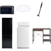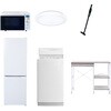 用途寮や事務所、休憩室などに。会社 オフィス 事務室 休憩室 仮眠室 ラウンジ 給湯室 寮 合宿 施設 宿泊 民泊 ホテル 旅館 宿舎 新生活 引越し 単身赴任 大学入学 スターターセット 家電セット 冷蔵庫 洗濯機 オーブンレンジ シーリングライト 軽量クリーナー レンジラック仕様【オーブンレンジ】幅48.5×奥行37.6×高さ30.2cm●容量18L、フラットテーブル●高周波出力:650W(60Hzのみ)/500W/200W相当【シーリング】幅50×奥行50×高さ9.5cm●全光束:3500lm●30分、60分OFFタイマー付き【ラック】幅102.5×奥行46.5×高さ85.5cm●棚やコンセントの高さを、モノに合わせて変更可能●2口コンセント付き(計1500Wまで)でよく使う家電や雑貨をすっきりひとまとめ【冷蔵庫】幅47.4×奥行50.6×高さ144cm●容量:157L(冷蔵109L/冷凍48L)●年間消費電力量:268kWh/年(50Hz/60Hz)【掃除機】スティック時サイズ:幅22.6×奥行10.3×高さ100cm●ハンディ時サイズ:幅7.5×奥行7.5×高さ46cm●わずか870gの軽量クリーナー●吸込仕事率:(パワフル)46W、(標準)23W、(弱)15W【洗濯機】幅56×奥行54.5×高さ98cm●容量:6.0kg(洗濯時)、1.5kg(風乾燥時)●8つのコース搭載(標準・毛布・おいそぎ・ドライ・ソフト・つけおき・部屋干し・槽洗浄)セット内容洗濯機、冷蔵庫、オーブンレンジ、シーリングライト、軽量クリーナー、レンジラック保証期間1年(ラック以外)内容量1セット