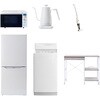 用途寮や事務所、休憩室などに。会社 オフィス 事務室 休憩室 仮眠室 ラウンジ 給湯室 寮 合宿 施設 宿泊 民泊 ホテル 旅館 宿舎 新生活 引越し 単身赴任 大学入学 スターターセット 家電セット 冷蔵庫 洗濯機 オーブンレンジ 温調ケトル スティッククリーナー レンジラック仕様【洗濯機】幅56×奥行54.5×高さ98cm●容量:6.0kg(洗濯時)、1.5kg(風乾燥時)●8つのコース搭載(標準・毛布・おいそぎ・ドライ・ソフト・つけおき・部屋干し・槽洗浄)【オーブンレンジ】幅48.5×奥行37.6×高さ30.2cm●容量18L、フラットテーブル●高周波出力:650W(60Hzのみ)/500W/200W相当【ラック】幅102.5×奥行46.5×高さ85.5cm●棚やコンセントの高さを、モノに合わせて変更可能●2口コンセント付き(計1500Wまで)でよく使う家電や雑貨をすっきりひとまとめ【冷蔵庫】幅47.4×奥行49.5×高さ113cm●容量:106L(冷蔵室73L/冷凍室33L)●年間消費電力量:268kWh/年(50Hz/60Hz)【掃除機】スティック時サイズ:幅24×奥行13×高さ111cm●ハンディ時サイズ:幅10×奥行10.5×高さ48cm●スティック&ハンディの2WAY●吸込仕事率:40W【電気ケトル】幅28.5×奥行18×高さ22.5cm●容量:800ml●温度設定範囲:60-100度の間で1度単位で温度調整可能セット内容洗濯機、冷蔵庫、オーブンレンジ、温調ケトル、スティッククリーナー、レンジラック保証期間1年(ラック以外)内容量1セット