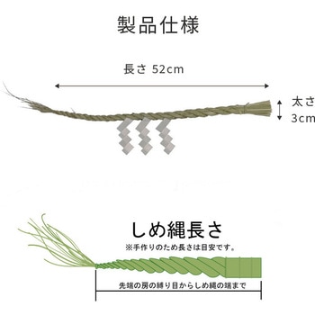 お寺様の外神様のしめ縄が劣化して、大祭を控えて新しい縄に交換するために購入したもの。年末年始の季節外れの時期でした、御社のホームページで、比較的お値打ちに購入でき助かりました。要望事項として、太さが3センチメートルでした、もう少し細い商品があると小さな祠に備えるときにバランスが良い思います。