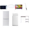 用途寮や事務所、休憩室などに。会社 オフィス 事務室 休憩室 仮眠室 ラウンジ 給湯室 寮 合宿 施設 宿泊 民泊 ホテル 旅館 宿舎 新生活 引越し 単身赴任 大学入学 スターターセット 家電セット 冷蔵庫 洗濯機 オーブンレンジ シーリングライト 液晶テレビ スティッククリーナー レンジラック仕様【TV】本体寸法:幅71.6×奥行9.3×高さ 42.4cm●スタンド取付時サイズ:幅71.6×奥行19.9×高さ47.4cm●サイズ:32V型●2K対応ハイビジョン液晶テレビ【オーブンレンジ】幅48.5×奥行37.6×高さ30.2cm●容量18L、フラットテーブル●高周波出力:650W(60Hzのみ)/500W/200W相当【シーリング】幅50×奥行50×高さ9.5cm●全光束:3500lm●30分、60分OFFタイマー付き【ラック】幅102.5×奥行46.5×高さ85.5cm●棚やコンセントの高さを、モノに合わせて変更可能●2口コンセント付き(計1500Wまで)でよく使う家電や雑貨をすっきりひとまとめ【冷蔵庫】幅47.4×奥行49.5×高さ113cm●容量:106L(冷蔵室73L/冷凍室33L)●年間消費電力量:268kWh/年(50Hz/60Hz)【掃除機】スティック時サイズ:幅24×奥行13×高さ111cm●ハンディ時サイズ:幅10×奥行10.5×高さ48cm●スティック&ハンディの2WAY●吸込仕事率:40W【洗濯機】幅56×奥行54.5×高さ98cm●容量:6.0kg(洗濯時)、1.5kg(風乾燥時)●8つのコース搭載(標準・毛布・おいそぎ・ドライ・ソフト・つけおき・部屋干し・槽洗浄)セット内容洗濯機、冷蔵庫、オーブンレンジ、シーリングライト、液晶テレビ、スティッククリーナー、レンジラック保証期間1年(ラック以外)内容量1セット