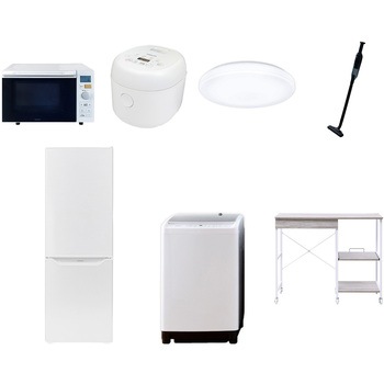 用途寮や事務所、休憩室などに。会社 オフィス 事務室 休憩室 仮眠室 ラウンジ 給湯室 寮 合宿 施設 宿泊 民泊 ホテル 旅館 宿舎 新生活 引越し 単身赴任 大学入学 スターターセット 家電セット 冷蔵庫 洗濯機 オーブンレンジ 炊飯器 シーリングライト 軽量クリーナー レンジラック仕様【オーブンレンジ】幅48.5×奥行37.6×高さ30.2cm●容量18L、フラットテーブル●高周波出力:650W(60Hzのみ)/500W/200W相当【シーリング】幅50×奥行50×高さ9.5cm●全光束:3500lm●30分、60分OFFタイマー付き【ラック】幅102.5×奥行46.5×高さ85.5cm●棚やコンセントの高さを、モノに合わせて変更可能●2口コンセント付き(計1500Wまで)でよく使う家電や雑貨をすっきりひとまとめ【冷蔵庫】幅50×奥行56×高さ142.2cm●容量:173L(冷蔵室121L/冷凍室52L)●年間消費電力量:250kWh/年(50Hz/60Hz)【掃除機】スティック時サイズ:幅22.6×奥行10.3×高さ100cm●ハンディ時サイズ:幅7.5×奥行7.5×高さ46cm●わずか870gの軽量クリーナー●吸込仕事率:(パワフル)46W、(標準)23W、(弱)15W【洗濯機】幅60×奥行59.5×高さ94.5cm●容量:8.0kg(洗濯時)、1.5kg(風乾燥時)●8つのコース搭載(標準・毛布・おいそぎ・ドライ・ソフト・つけおき・部屋干し・槽洗浄)【炊飯器】幅21.5×奥行25.8×高さ20.8cm●炊飯容量:3.0合炊き●11種の炊き分けメニュー:白米ふつう、白米やわらかめ、白米かため、省エネ、早炊き、お湯炊き、パン、玄米、雑穀米、おかゆ、炊込みセット内容洗濯機、冷蔵庫、オーブンレンジ、炊飯器、シーリングライト、軽量クリーナー、レンジラック保証期間1年(ラック以外)内容量1セット