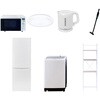 用途寮や事務所、休憩室などに。会社 オフィス 事務室 休憩室 仮眠室 ラウンジ 給湯室 寮 合宿 施設 宿泊 民泊 ホテル 旅館 宿舎 新生活 引越し 単身赴任 大学入学 スターターセット 家電セット 冷蔵庫 洗濯機 オーブンレンジ シーリングライト 電気ケトル 軽量クリーナー 家電収納ラック仕様【オーブンレンジ】幅48.5×奥行37.6×高さ30.2cm●容量18L、フラットテーブル●高周波出力:650W(60Hzのみ)/500W/200W相当【シーリング】幅50×奥行50×高さ9.5cm●全光束:3500lm●30分、60分OFFタイマー付き【ラック】幅59×奥行40×高さ192.5cm●棚やコンセントの高さを、モノに合わせて変更可能●2口コンセント付き(計1500Wまで)でよく使う家電や雑貨をすっきりひとまとめ【冷蔵庫】幅50×奥行56×高さ142.2cm●容量:173L(冷蔵室121L/冷凍室52L)●年間消費電力量:250kWh/年(50Hz/60Hz)【掃除機】スティック時サイズ:幅22.6×奥行10.3×高さ100cm●ハンディ時サイズ:幅7.5×奥行7.5×高さ46cm●わずか870gの軽量クリーナー●吸込仕事率:(パワフル)46W、(標準)23W、(弱)15W【洗濯機】幅60×奥行59.5×高さ94.5cm●容量:8.0kg(洗濯時)、1.5kg(風乾燥時)●8つのコース搭載(標準・毛布・おいそぎ・ドライ・ソフト・つけおき・部屋干し・槽洗浄)【電気ケトル】幅21.5×奥行15×高さ18.5cm●容量:1.0L●空焚き防止機能搭載セット内容洗濯機、冷蔵庫、オーブンレンジ、シーリングライト、電気ケトル、軽量クリーナー、家電収納ラック保証期間1年(ラック以外)内容量1セット