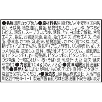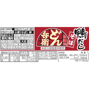種別そば質量(g)116種類即席カップめんシリーズどん兵衛内容量(g)104保存方法においが強いもののそばや直射日光を避け、常温で保存してください使用の目安お湯の目安量:390ml原材料油揚げめん(小麦粉(国内製造)、そば粉、植物油脂、食塩、植物性たん白、しょうゆ、かつおぶし粉末、糖類)、スープ(しょうゆ、糖類、たん白加水分解物、合鴨エキス、食塩、合鴨調味油、鶏脂、魚介エキス、酵母エキス、合鴨脂、香味油、かつおぶし粉末、植物油脂)、かやく(鶏つくね、ねぎ、揚げ玉)/加工でん粉、調味料(アミノ酸等)、リン酸塩(Na)、カラメル色素、炭酸Ca、香料、増粘剤(キサンタンガム)、酸化防止剤(ビタミンE)、pH調整剤、ビタミンB2、ビタミンB1、ベニコウジ色素、(一部にえび・小麦・そば・卵・乳成分・大豆・鶏肉・豚肉を含む)アレルギーえび、小麦、そば、卵、乳、大豆、鶏肉、豚肉入数(個)12栄養成分(1食(104g)当たり)エネルギー:413kcal、たんぱく質:11.0g、脂質:18.1g、炭水化物:51.5g、食塩相当量:6.3g、ビタミンB1:0.31mg、ビタミンB2:0.39mg、カルシウム:130mg内容量1箱(104g×12個)