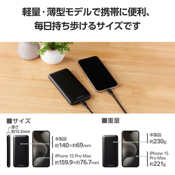 用途たっぷり使える10000mAhで長時間の外出時も安心。持ち運びしやすい薄型形状のモバイルバッテリーです。