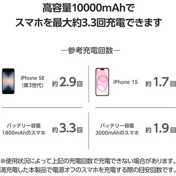 ※満充電した本製品で電源オフの状態のスマートフォンを充電する際の目安回数です。充電中に電源を入れたり、機器を使用したりしている場合は記載の数値まで充電できない場合があります。