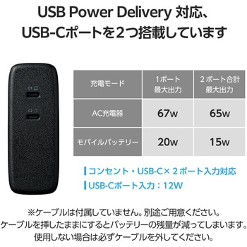 AC充電器として1ポート接続時67W、2ポート同時接続時65Wの出力が可能。スマートフォンとノートパソコンを同時に充電できます。パソコンで作業をしている間にスマートフォンの充電を済ませられるから、出張時・外出時にぴったりです。