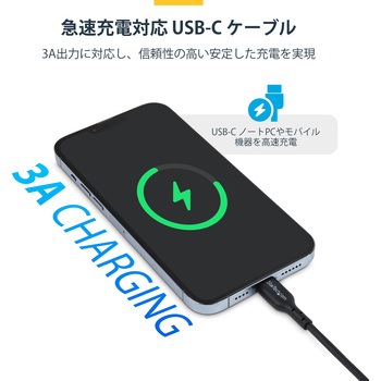 USB-C充電ケーブル:USB C対応ノートパソコンやモバイル機器を3A出力で高速充電できる高品質Type-C Type-Cケーブル。USB-C充電器やモバイルバッテリーに接続でき、最大60WのUSB Power Delivery 2.0に対応