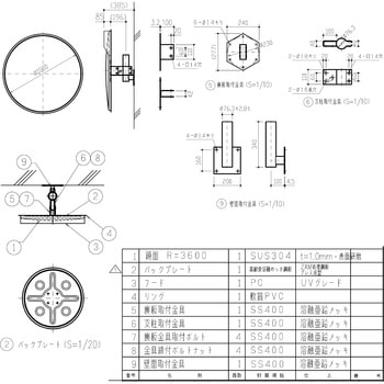 材質鏡面:SUS304、裏板:高耐食亜鉛メッキ、フード:ポリカーボネート、取付枠:塩化ビニール仕上研磨内容量1台