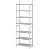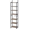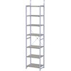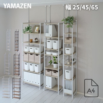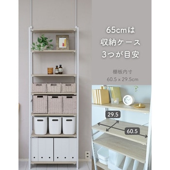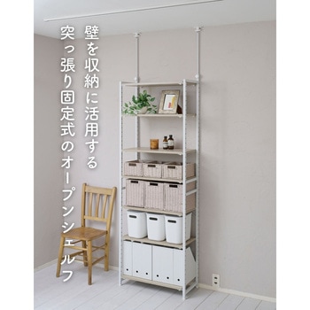 天井まで収納に使える、突っ張り固定式のオープンラック。工具不要(六角レンチ付属)。全段高さが変えられる可動棚仕様。A4ファイルまで対応可能な奥行設計。棚板は傷や汚れに強い、メラミン樹脂加工。背面にクロスバーで補強。脚にはアジャスター付きでガタつきを緩和。棚板は約4cm間隔で可動(上段22段階、下段21段階)。中央部は約12cmの空間。棚板はノブをひねるだけで着脱できる金具仕様。棚下金具の飛び出し:厚み約1cm最下段設定時、棚板下から床までの隙間:7.5cm
