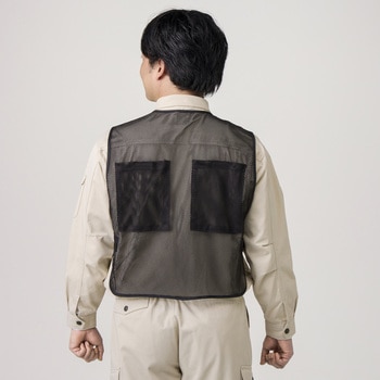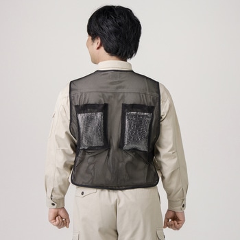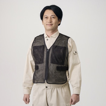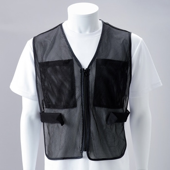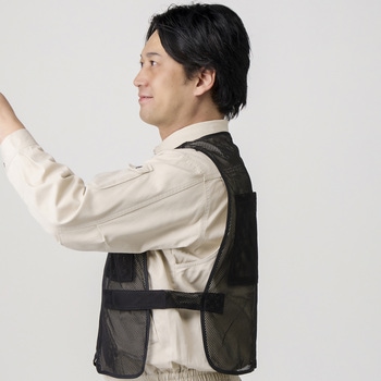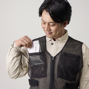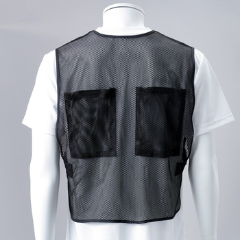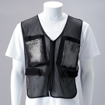 前後に大きなポケットが付いたメッシュ製のベストです。夏場は暑さ対策として保冷剤、冬場は寒さ対策としてカイロ入れに便利な大サイズのポケットになっています。保冷剤を入れた際に服が濡れないよう改良し、丈も長くしております。ポケットには面ファスナーが付いており、挿入物が飛び出しにくい作りになっています。胴回りは両サイドにある面ファスナー付きベルトで調整ができます。前面ファスナーで着脱が簡単。