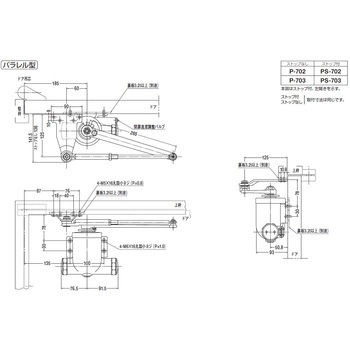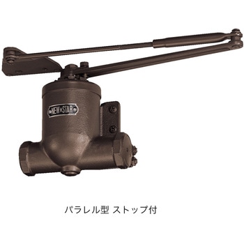 頑強なボディーと高性能なスプリングにより高開閉効率。アンティーク調を演出するのに最適。閉扉速度調整は2バルブ方式。ラッチング角度は調整可能。調整ネジ棒にて調整出来ます。ストップ角度はパラレル型が70°~180°、スタンダード型が70°~90°の任意の角度に設定可能。左右兼用タイプ。開き勝手により、アーム差込み方向が変わります。