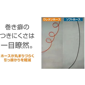 圧縮空気用エアホースを巻いたホースリール。天井付け・壁付けの2パターンの設置が可能。長尺リールをお探しの方におすすめ。火花に強い耐火花ホース。巻き癖がつきにくく、耐火花性も高いソフトホース仕様。メンテナンスを向上させるラクラク継手仕様ホース根元部側に別途継手を設けることにより、本体部分の分解をすることなく誰でも簡単にホース交換ができます。耐久性向上!SUSプロテクター開口部にSUSプロテクターを装備することでリールを引き出す際の樹脂カバーの消耗を解消。樹脂カバーの耐久性が大幅に向上し、環境負荷の軽減につながります。