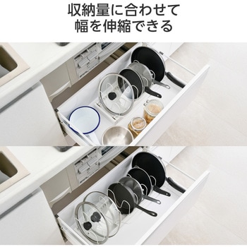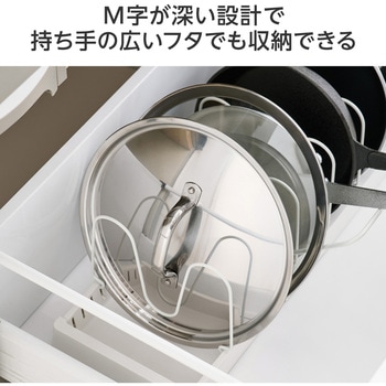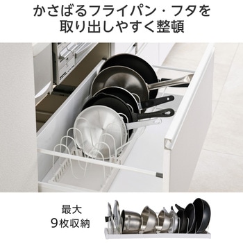 フライパンや鍋のふたが最大9枚まで収納可能。ぐらつかない仕切りパーツで安定感もあります。