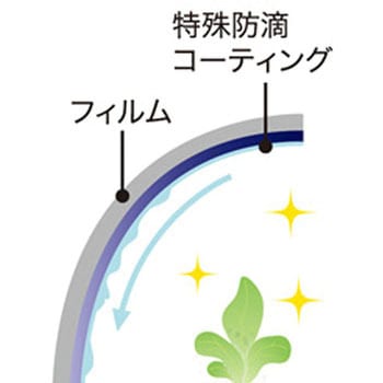 耐久性に優れ、複数年の展張が可能です。特殊な防滴剤が塗布されており、ハウス内に発生した結露水は落下せずフィルムをつたって流れていきます。練込型は添加された原料が無くなると効果が終了しますが、塗布型は練込型に比較し長期間安定的に効果を発揮します。特殊樹脂をバランスよく5層構造へ配合し、優れた強度があります。