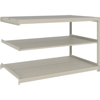 棚板厚さを中軽量棚用の35mmから22mmにして収納容積を5%増やしました。支柱はM1.5中軽量棚と兼用ですので耐荷重が必要な段ではM1.5用の追加棚板セットが使えます。(中受けはそれぞれ専用のものをお使いください。)棚板は1段につき2枚の分割式です。ボルトレス仕様ですので組み立てが簡単です。