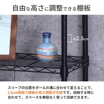 棚板は、約2.45cm間隔で高さ調整が可能。収納する物や用途に合わせて高さの調整ができるので、ラック内のスペースを無駄なく使って収納することができます。