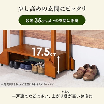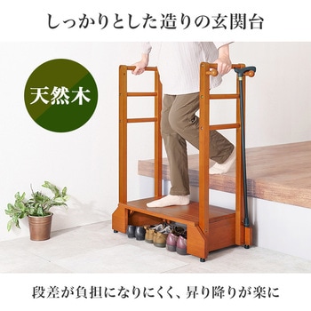 玄関や段差がある場所の上り下りが楽になる玄関踏み台。手すりが付いているので、安定して乗り降りすることができ、ひざへの負担を減らし転倒防止にもなります。高級感のある天然木は玄関のインテリアにも馴染みやすく、カバンやステッキ、杖を掛けられる便利なフック付きで台の下には靴も収納可です。ペット用としても活躍します。