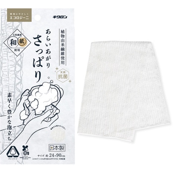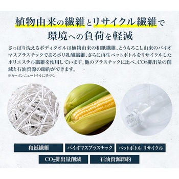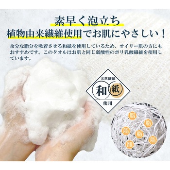 天然繊維「和紙」使用でオイリー肌の方にもおすすめのさっぱり洗えるボディタオルです。あぶらとり紙のように余分な脂分を吸着させる「和紙」を編み込むことで、さっぱり洗え程よい刺激がくせになる洗い心地を実現させました。天然の抗菌効果があるポリ乳酸繊維と再生PET使用のポリエステルを、空間を作って一緒に編み上げているので泡立ち水切れに優れ衛生的で環境にも配慮しています。パッケージには再生紙を使用しています。