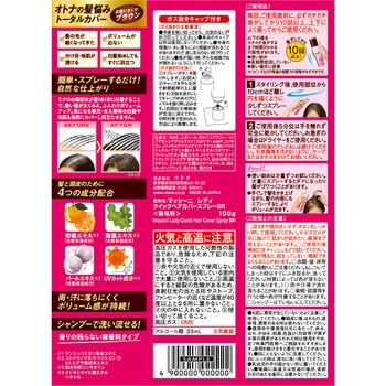 ミクロの微粉末が髪1本1本に付着し、薄毛のボリュームアップと白髪隠しが同時にできる女性用ヘアカバースプレー。ブラウン。雨・汗に落ちにくく、ボリューム感が持続します。シャンプーで洗い流せます。