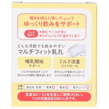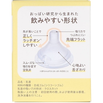 ・ゆっくり少しずつ飲める乳首。・飲んで口からミルクが溢れてしまう子や、飲むペースが早い子に。・おっぱい研究から作りだした形状・ミルクがしみ出て、吸う力によって出る量がコントロールされるマルチフィット乳孔。・シリコーンゴム製・日本製