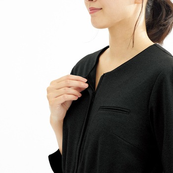 肩パッドなし、胸ポケットのインク染み出し防止生地使用、おうち洗濯可能、抗菌防臭加工、フロントファスナー開き