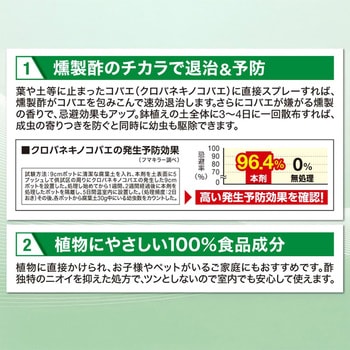 有効成分:酢酸土から発生するコバエ(クロバネキノコバエ)を退治&予防。高効力*くん製酢を使用。ツンとしない酢独特のニオイを抑えた配合。100%食品成分。室内園芸、観葉植物などに。幼虫にも効く(忌避効果)